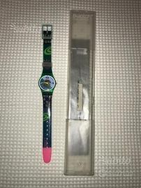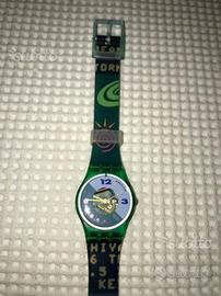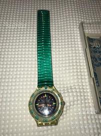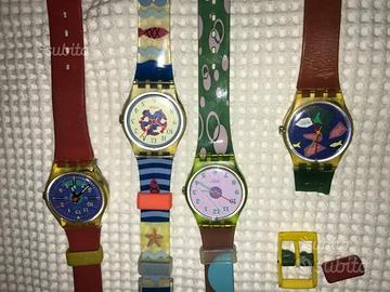Collezione di 7 Swatch di cui 5 mini degli anni 80, differente stato di usura (uno con cinturino rotto come da foto) e uno Scuba Swatch anni 90, modello Diving to 200 m con cinturino in plastica blu e quadrante blu verde e giallo e Swatch Mint Drops scuba cassa in plastica e cinturino in acciaio elastico, che come si può vedere dalla foto è rotto.