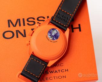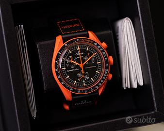 Questo orologio non limitato vanta una cassa, una corona e dei pulsanti in Bioceramic di un vivace colore arancione e un cinturino in VELCRO® nero con impunture arancioni a contrasto. Il modello presenta un quadrante nero con lancette e indici arancioni. La lancetta dei secondi cronografici è arancione, in omaggio al colore e alla forma del modello Speedmaster Moonwatch "Ultraman" di OMEGA del 1968. I quadranti secondari sono caratterizzati da numeri arabi e indici disposti a raggiera, in omaggio ai progetti Speedmaster Alaska II e III. La lunetta nera è ornata da una scala tachimetrica bianca e dalla scritta "TACHYMÈTRE" in arancione. Tutti i quadranti della collezione recano il marchio OMEGA X Swatch, l'iconico logo Speedmaster e il logo MoonSwatch. La forma bombata del vetro biosourced, la "S" incisa al centro del vetro, il raffinato e sofisticato motivo circolare sull'anello esterno del quadrante e sui quadranti secondari incassati, la struttura angolare e armoniosa delle anse, l'iconico dettaglio del punto sopra il 90 sulla scala tachimetrica e, naturalmente, l'esclusiva sensazione al tocco del Bioceramic, sono comuni a tutti i modelli. Le lancette delle ore, dei minuti e gli indici sono dotati di Super-LumiNova® (emissione verde) per una perfetta illuminazione al buio.