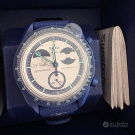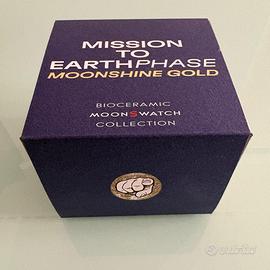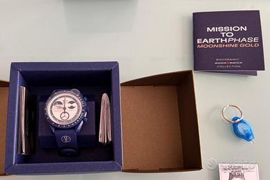 SWATCH MISSION TO EARTHPHASE - MOONSHINE GOLD di ottobre SO33N703L trae ispirazione dalla Luna del cacciatore ed è stato ripensato con una mano umana che punta direttamente verso chi la indossa sull'indicatore delle fasi lunari.