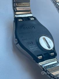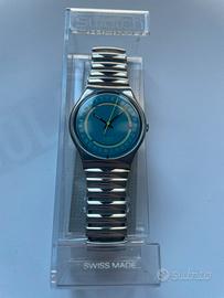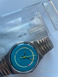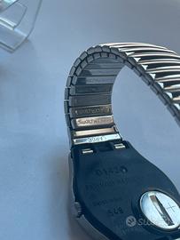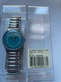 Swatch Gent Flex “STOPLIGHT” ref. GY402 originale del 1990, in condizioni NUOVO (NOS – New Old Stock), mai indossato. Modello iconico anni ’90 caratterizzato da un design unico: quadrante blu/verde con numerazione 1–31 disposta in senso circolare e indicatore colorato del giorno, soluzione grafica tipica Swatch vintage. Cassa in plastica con finitura argentata e raro cinturino flex metallico regolabile, molto più ricercato rispetto ai classici cinturini in plastica. Caratteristiche: •Movimento al quarzo Swiss Made •Diametro cassa circa 34 mm •Impermeabile 3 bar •Cinturino elastico in metallo •Modello unisex Condizioni impeccabili: •Mai indossato •Fondo e cassa perfetti •Conservato con cura •(eventuale: completo di scatola e documenti originali se presenti) Orologio vintage da collezione, sempre più difficile da trovare in stato NOS. Ideale per collezionisti Swatch o per chi cerca un pezzo autentico anni ’90.