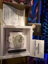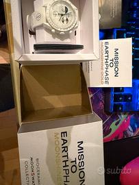 Omega x Swatch Moonshine Gold MoonSwatch Edizione speciale MoonSwatch con lancetta cronografica in Moonshine™ Gold (lega esclusiva Omega), prodotta in quantità limitate e rilasciata solo in date selezionate. Cassa in bioceramica, movimento al quarzo, design ispirato allo Speedmaster Moonwatch. Dettaglio distintivo: la lancetta dorata, spesso legata a eventi o lune particolari, rende ogni uscita unica e molto collezionabile. Garanzia 2 anni scontrino e borsa scatola nuovo mai indossato