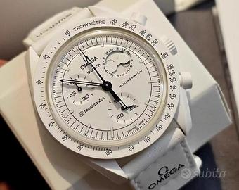 MODEL: Swatch Moonswatch Mission to the Moonphase Snoopy New Moon REF: SO33W700 YRS: 2024 BOX AND PAPER: Full set MORE: --------- PAPER FROM: Italy -L'OROLOGIO È STATO PRIVATO DELLA PELLICOLA FRONTALE SOLO PER ESEGUIRE LE FOTOGRAFIE, L'OROLOGIO È NUOVO MAI USATO E COMPLETO DI TUTTI GLI ACCESSORI- Per ulteriori foto o info contattateci In celebrazione della luna piena, questo modello presenta un colore completamente bianco, cassa, corona e pulsanti Bioceramic ed un cinturino VELCRO©. La lancetta dei secondi del cronografo, le lancette del quadrante secondario e la lunetta della scala tachimetrica sono neri, mentre i quadranti secondari e lo sfondo della lunetta sono bianchi. Questo modello si distingue per l'indicazione delle fasi lunari, probabilmente la più poetica di tutte le complicazioni orologiere. Snoopy, mascotte della NASA dagli anni Sessanta, è raffigurato sdraiato sulla luna sul disco delle fasi lunari, che ruota nel quadrante secondario a ore due. Alla luce ultravioletta compare sull'esclusivo quadrante una citazione nascosta tratta dal fumetto di Snoopy, incastonata tra stelle e lune crescenti. Tutti i quadranti sono caratterizzati dal marchio OMEGA X Swatch, dall'iconico logo Speedmaster e dal nuovo logo MoonSwatch. Il vetro in forma bombata, la "S" incisa al centro del vetro che richiama il logo Swatch, il raffinato e sofisticato motivo circolare sull'anello esterno del quadrante e i quadranti secondari incassati, la struttura affilata e liscia delle anse, l'iconico dettaglio del punto sopra il 90 sulla lunetta Bioceramic della scala tachimetrica e, naturalmente, l'esclusivo tocco del Bioceramic sono comuni a tutti i modelli. Gli indici, le lancette delle ore, dei minuti e la punta della lancetta dei secondi cronografici sono dotati di Super-LumiNova® di grado A per una perfetta illuminazione al buio. Gioiellieri dal 1980 Gioielleria storica di Bologna, affidabilità e serietà sono i nostri principi.