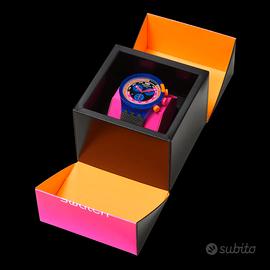 Quest’orologio extra-large s’ispira a uno Swatch CHRONO anni Novanta: il GRAND PRIX da collezione (SCJ101). Le sue caratteristiche principali includono un quadrante vivace e multicolore con indici delle ore e tacche dei minuti della lunetta interna al quadrante che si illuminano al buio e una scala tachimetrica, il tutto sotto un vetro biosourced. Anche la punta rosa delle lancette di ore e minuti e quella blu scuro delle lancette dei secondi del cronografo si illuminano al buio. La cassa trasparente biosourced color blu opaco ha una lunetta abbinata con dettagli arancioni opachi e pulsanti multicolore, Completano il modello un cinturino strutturato nero opaco trasparente con passanti trasparenti nero e blu opaco e una mezza fibbia blu opaco trasparente. Tutto è realizzato con materiale biosourced.