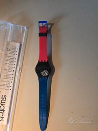 Swatch “Nine to Six” – Vintage anni ‘90 – Nuovo full set Vendo splendido orologio Swatch Nine to Six originale, uno dei modelli più iconici e riconoscibili della produzione Swatch anni ‘90, caratterizzato da un design grafico audace e artistico. 🔹 Condizioni: Nuovo, mai indossato 🔹 Corredo: Scatola originale Swatch 🔹 Marca: Swatch 🔹 Modello: Nine to Six 🔹 Collezione: Swatch Originals Gent 🔹 Movimento: Quarzo svizzero (Swiss Made) 🔹 Cassa: Plastica/resina nera 🔹 Diametro cassa: circa 34 mm 🔹 Vetro: Plexiglass 🔹 Quadrante: Grafica geometrica multicolore (stile pop/art) 🔹 Cinturino: Originale bicolore rosso/blu 🔹 Chiusura: Fibbia standard Swatch 🔹 Impermeabilità: Water resistant (uso quotidiano) 💡 Modello molto ricercato tra i collezionisti per il design unico e l’identità anni ‘90. non spedisco, consegna a mano