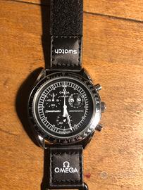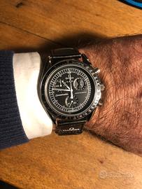 Moonswatch Snoopy incassato su cassa acciaio Speedmaster, doppio cinturino tessuto strap Omega Swatch e cinturino acciaio