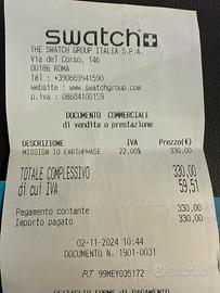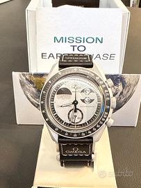 Il cronografo MISSION TO EARTHPHASE, presenta una cassa, una corona e pulsanti in Bioceramic grigio chiaro, abbinati a un cinturino VELCRO® nero con impunture grigio chiaro a contrasto e passante in Bioceramic. Il quadrante grigio, con una trama granulare che ricorda la superficie lunare, è impreziosito da una scala tachimetrica in un’elegante tonalità nera e indici in una nuova tonalità di grigio chiaro. Per celebrare la Luna e la Terra, vanta una funzione di fasi lunari e una funzione di fasi terrestri brevettata. Due lune sovradimensionate con Super-LumiNova® (emissione di luce bianca) sono visibili sul disco delle fasi lunari, che ruota nel quadrante secondario a ore 2. La funzione di fase terrestre, situata nel quadrante a ore 10, è colorata. Per un tocco ultraterreno, gli oceani sono rivestiti di inchiostro UV, visibile solo alla luce ultravioletta. Sul coperchio della batteria compare un’immagine della Luna, con l’impronta di Neil Armstrong, il primo uomo a mettervi piede. Tutti i quadranti della collezione recano il marchio OMEGA X Swatch, l’iconico logo Speedmaster e il logo MoonSwatch. La forma bombata del vetro biosourced, la “S” incisa al centro che richiama il logo Swatch, il raffinato e sofisticato motivo circolare sull’anello esterno del quadrante e sui quadranti secondari incassati, la struttura angolare e armoniosa delle anse e, naturalmente, l’esclusiva sensazione al tocco del Bioceramic sono elementi comuni a tutti i modelli. Gli indici, le lancette delle ore e dei minuti e la punta della lancetta dei secondi cronografici sono rivestiti di Super-LumiNova® di grado A per una perfetta illuminazione al buio (emissione verde).