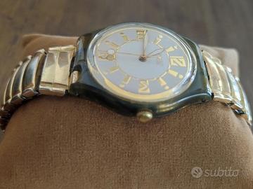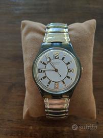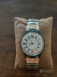 Raro orologio Swatch “Lampadario” vintage del 1995 al quarzo. Batteria in ordine: funziona perfettamente. Orologio unisex con un quadrante da 12 ore, dall’aspetto elegante e raffinato. Il quadrante è una splendida combinazione di oro e bianco, con indici dorati. Caratterizzato da una cassa trasparente con cinturino elasticizzato in acciaio, dorato all’esterno (misura small). Patented Water Resistant, Swiss Made 6549. AG 1995.