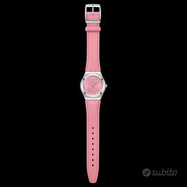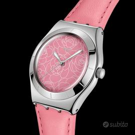 Questo elegante orologio in acciaio inossidabile presenta un quadrante rosa spazzolato soleil con un motivo floreale bianco stampato, lancette delle ore e dei minuti color argento che si illuminano al buio e una lancetta dei secondi sempre color argento. L'orologio ha una cassa in acciaio inossidabile lucidato e una lunetta abbinata con indici incisi. Completano il look un cinturino in pelle rosa con cuciture rosa con passante in pelle rosa e una fibbia in acciaio inossidabile lucido.