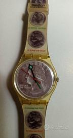 Swatch Gent Sesterce (GK255) del 1997 con cinturino in plastica trasparente e quadrante a moneta.