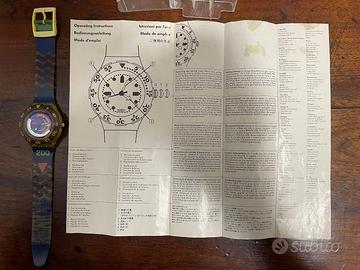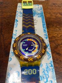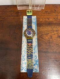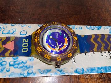 Swatch Scuba 200 Coming Tide – 1992. Ancora nella sua confezione originale con certificato. Usato, in buone condizioni, cinturino in plastica e vetro in plexiglas leggermente rovinati, dovuto all'uso Testato e funzionante Per altre info o foto non esitare a chiedere (vendo senza pila)