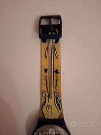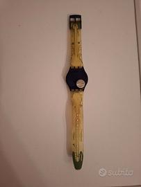 Per gli appassionati di Swatch e del design pop, vendo l'originale Swatch "Twitch Twins" (GN168). Questo iconico orologio, lanciato nel 1997, è celebre per il suo cinturino in plastica trasparente e il quadrante argentato/blu, entrambi decorati con le vivaci e uniche illustrazioni di gemelli in stile fumetto (disegnate da Massimo Giacon) che "si muovono e si mordono". Un pezzo che incarna lo spirito giocoso e artistico degli anni '90.