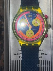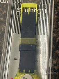 Orologio swhatch da collezione. È stato sempre nella sua scatola e non è stato mai utilizzato l’acquisto è stato fatto nel 1992 come in foto . È un po impolverato ma se avete bisogno di più foto dettagliate mi scrivete in privato . Ha qualche segno di usura sia sulla plastica che sulla parte centrale come in foto. Non garantisco la sua funzionalità.gli va data una pulita che non me la sento di fare per non rovinarlo