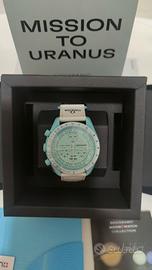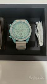 Il quadrante include i loghi OMEGA X Swatch e lo storico logo Speedmaster.