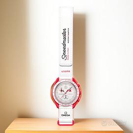 Su questo orologio, in edizione non limitata, tonalità rosso ardente entrano in contrasto con il quadrante bianco brillante e il cinturino in VELCRO®. La lancetta dei secondi del cronografo è rossa, mentre le lancette dei quadranti secondari alle ore 10 e alle ore 2 presentano lancette uniche di colore rosso, con un'allegra forma a navicella spaziale, riferimento speciale allo Speedmaster Alaska II OMEGA. La lancetta del quadrante secondario a ore 6 è nera, mentre quella delle ore e dei minuti è bicolore, bianca e nera. La lunetta è bianca e presenta una scala tachimetrica nera. Tutti i quadranti della collezione sono caratterizzati dal marchio OMEGA X Swatch, dall'iconico logo Speedmaster e dal logo MoonSwatch.