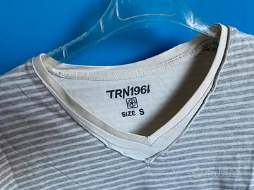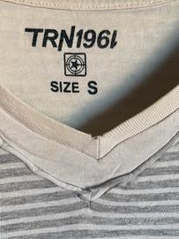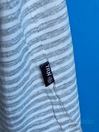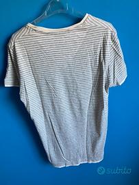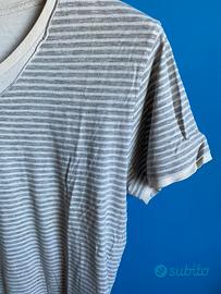 T-shirt in cotone a righe grigie e panna Terranova, taglia S. Scollo a V, fondo e fondo manica con inserto in tinta unita color panna. Etichetta a bandiera al fianco. Lunghezza cm. 63; spalle cm. 41. No etichetta di composizione e manutenzione.