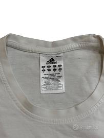 Design: Grande logo del Real Madrid stampato frontalmente con corona reale. Logo Adidas blu posizionato centralmente sotto lo stemma.