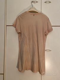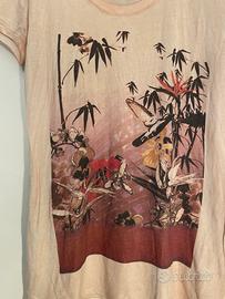 T-shirt AnnaRita N rosa antico chiaro con disegno con fiori, orchidee e piante sui toni del rosa più scuro, borgogna, marrone e panna nella parte anteriore. Taglia M. 100% cotone. In ottime condizioni.