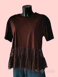 T-shirt in cotone color cioccolato con balze in pizzo tono su tono.