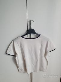 Vendo T-shirt OVS bianca con scritta “T-SHIRT” a contrasto. Modello crop, semplice e versatile, perfetta per outfit estivi e casual. Condizioni molto buone spedizione veloce o ritiro a mano In zona PADOVA/BASTIA scrivetemi pure.