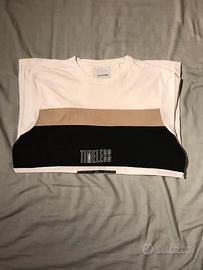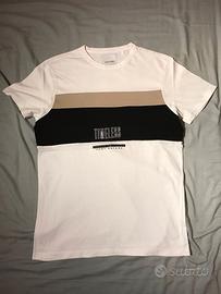 T-shirt da uomo bianca con inserti oro e neri, marca Clayton, taglia S, materiale cotone.