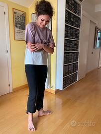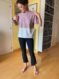 Morbidissima e fresca t shirt in polyestere bicolore, bianco e lilla con pratica tasca sul davanti. Originariamente maschile, ha subito delle modifiche nel senso della lunghezza (troppo lunga, poggiava male sui miei fianchi). Taglia S, veste fino a una 42-44 (la modella è una 38) e misura 46 cm di spalle, 50.5 cm di giro-petto e 49 cm di lunghezza. Continuava a cadermi male per cui non l'ho MAI INDOSSATA. Marchio Zara.