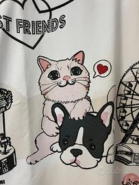 Colore bianco, con stampa frontale molto dettagliata e simpatica: gatto e cagnolino, cuori, giostra e ruota panoramica.