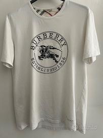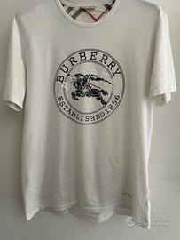 Splendida t-shirt Burberry autentica, caratterizzata dal maxi logo circolare "Established 1856" con l'iconico cavaliere Prorsum sul petto. 100% Cotone di alta qualità, morbido al tatto e traspirante. Ottime condizioni generali, ben conservata. Disponibile per ulteriori foto o misure precise su richiesta.