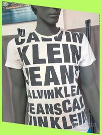 T-shirt originale Calvin Klein Jeans, bianca con maxi stampa nera CALVIN KLEIN JEANS su tutto il davanti. Stile moderno e di impatto.