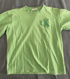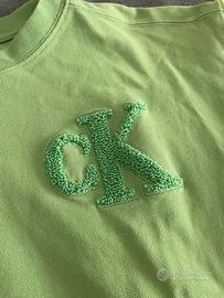Splendida t-shirt firmata Calvin Klein Jeans in un vivace color verde prato. Il modello è caratterizzato da un grande logo "CK" sul petto realizzato in morbida ciniglia a rilievo (effetto bouclé) in tinta. Dettagli che fanno la differenza: Materiale: 100% Cotone di alta qualità con trama piqué (molto resistente e traspirante). Vestibilità: Taglio moderno leggermente boxy. Condizioni: Ottime, indossata pochissimo. Colore ancora molto vivido e logo perfettamente integro. Extra: Logo "Calvin Klein Jeans" ricamato tono su tono sulla manica (come da foto). Taglia: 14 anni (perfetta anche per una taglia XS o S da adulto, controllare le misure se necessario).