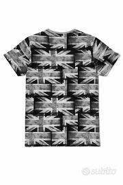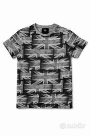 T-Shirt Cedar Wood State grigia a maniche corte con stampa della bandiera del Regno Unito in stile vintage su tutta la superficie.