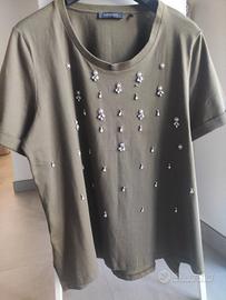 T-shirt in cotone di Elena Mirò con delle applicazioni sul davanti di strass e perline. Le maniche sono rifinite con una svoltina. Il colore direi che è un verde oliva anche se in foto non si vede bene. È una doppia XL ma ha una vestibilità asciutta. Il dietro è circa 3 cm più lungo rispetto al davanti. Anche se non ha più l'etichetta è nuova perché non è stata mai indossata.