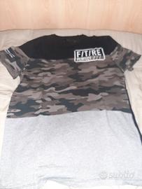 T shirt celio con fantasia camouflage nella parte centrale e sulle maniche, pezzo grigio sotto, retro tutto nero. Taglia L. Presenta anche una stampa in cima F/T/RE PERFECT. Usata una sola volta, in perfette condizioni