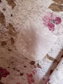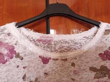 T-shirt con trasparenze in bianco con fiori e paillettes, made in italy, taglia indicativa M/L vedi larghezza in foto, dipende anche da quanto ti piace morbida-larga, in quasi ottime/ottime condizioni, a 5€,. ho anche altri annunci,.