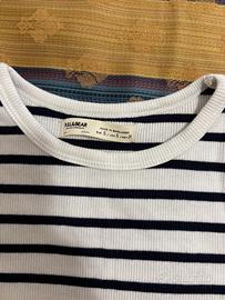 Vendo t-shirt bianca a righe blu modello corto taglia S marca Bershka per inutilizzo. La taglia veste giusta