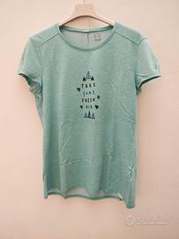 Due t-shirt Decathlon da donna in 37% cotone, 37% viscosa e 26% poliestere. Taglia S, la prima blu e la seconda verde acqua, entrambe con stampa frontale. Misure: ampiezza spalle 40 cm, torace 43 cm e lunghezza 61 cm. Ottime condizioni.