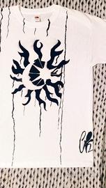 Maglietta bianca dipinta a mano con un potente simbolo centrale: un sole e una luna frammentati, attraversato da colature verticali che ricordano crepe, pioggia o cicatrici.