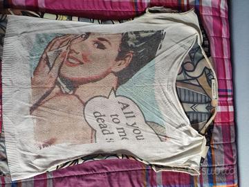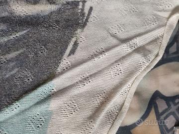 T-shirt lunga con disegno sul davanti e fantasia colorata dietro, in cotone, in ottime condizioni.