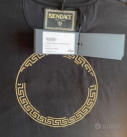 Tshirt nera in cotone Stampa logo Fendace dorata sul davanti Fendi X Versace collaborazione stampa logo Versace dorato sul retro cartellino Fendace taglia M