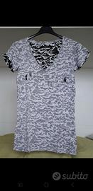 T-shirt donna Guess. Una di colore bianco, nero e grigio. Una di colore blu scuro con scritte color oro. Indossate solo un paio di volte quindi come nuove. 15 euro ciascuno. Taglia S.