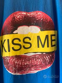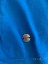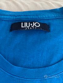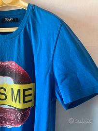 T-shirt blu, in cotone, con scritta gialla e rossa Logo metallico su un fianco Girocollo Marca Liu Jo Tg L