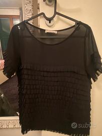 T-shirt donna, colore nero, con balze e trasparenze, marca peperosa, taglia 42
