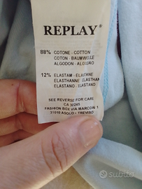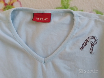 T-shirt donna Replay manica lunga con scollo a V, color azzurro, in morbido cotone ed elastan per un'ottima vestibilità. Taglia M, Nuovo mai indossato senza cartellino.