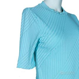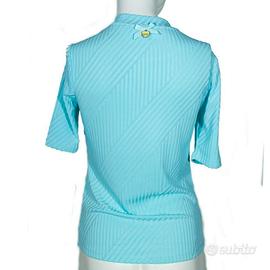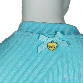 Maglietta azzurra lavorata di Silvian Heach tg XS. A girocollo, con maniche quasi a tre quarti, di colore azzurro turchese, è lavorata a strisce che si intersecano. Come lunghezza arriva sui fianchi. Dietro sul collo. si trova un piccolo fiocchetto dello stesso colore con il marchio Silvian Heach. Indossata poche volte