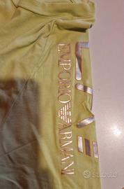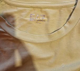 Vendo t-shirt Emporio Armani EA7 taglia L in una particolare tonalità color verde/lime. Il pezzo forte è la maxi stampa sulla spalla e manica sinistra in metallizzato, con logo e scritta del brand perfettamente integri.Grazie al 5% di elastan, la maglia è elasticizzata e si adatta perfettamente alla forma del corpo (effetto slim fit).Per il resto e' 95% cotone. La maglietta è stata tenuta con cura, ma segnalo per correttezza:la stampa del loto sotto il colletto e' un po' sbiadita,e nella zona ascellare sono presendi 2 segnetti non troppo rilevanti se non visti in vicinanza.Lunghezza spalle 55,lunghezza 65 cm.