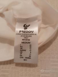T-shirt Freddy Training - Bianca (M) T-shirt sportiva Freddy originale, linea Training. Colore bianco con logo argento metallizzato. Tessuto in 100% cotone, leggero e traspirante. Ottime condizioni. Misure in piano: Lunghezza: 50 cm Spalle: 40 cm Torace: 47 cm Taglia: M (IT 44) Composizione: 100% Cotone