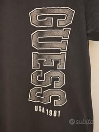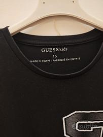 T-shirt Guess da bambino 16 anni, in 95% cotone e 5% elastame. Nera con stampa grigio/bianca. Misure: ampiezza spalle 42.5 cm, torace 46 cm e lunghezza 61.5 cm. Buone condizioni.