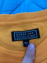 Vendo T-shirt originale GUESS, colore giallo con stampa grafica “VIBRAS ?” sul fronte.