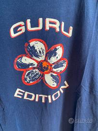 T-shirt Guru for everyday use in cotone blu, taglia S. Girocollo; davanti logo lettering e margherita nei colori bianco, rosso e arancione. Lunghezza cm. 61; spalle cm. 40; torace cm. 45. Composizione 100%Cotone. Normali segni di usura, ottime condizioni: vedere foto.