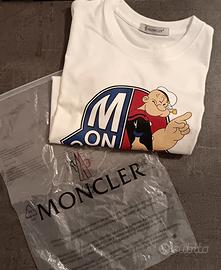 T shirt in cotone bianco con stampa frontale Popeye. Logo cucito Moncler sulla manica Taglia M