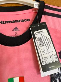 "La maglia della collezione Humanrace trasmette un messaggio positivo di unità in campo e fuori dal campo. L'artista Pharrell Williams reinterpreta in chiave contemporanea e super grafica la tonalità rosa protagonista della maglia Away nella stagione 2015/16. Il modello è un concentrato unico di stile, sport e rispetto per l'ambiente perchè è interamente realizzata in poliestere riciclato. Sul fronte e le maniche spiccano stampe grafiche che valorizzano l'impegno etico del progetto."